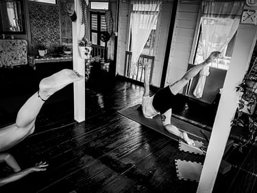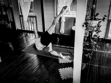 A pose like Thread the Needle with the leg lifted challenges this system directly. The cross-body rotation requires asymmetric pressurisation to prevent the spine from collapsing or over-rotating. When breath is integrated, you are training the stabilising cylinder in real time. The lifted leg further increases the demand, compelling the “floor” and “walls” to counter gravity’s pull.